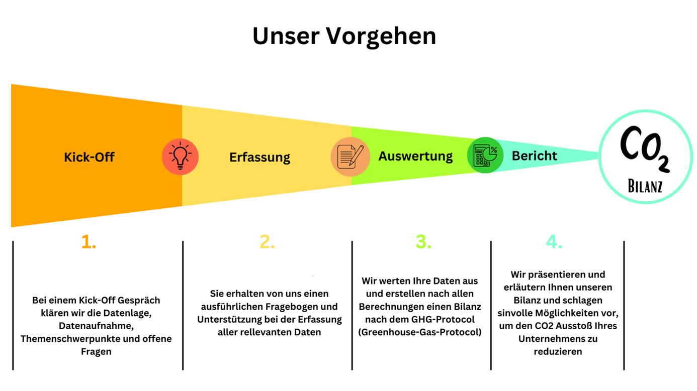 Um Ihre Position im Markt zu sichern, zeigen wir Ihnen im Rahmen unserer Beratung einen effizienten Weg zur Erstellung einer GHG-Bilanz auf (Treibhausgas-Bilanz oder landläufig auch CO₂-Bilanz genannt) und erstellen diese für Sie und Ihr Unternehmen.